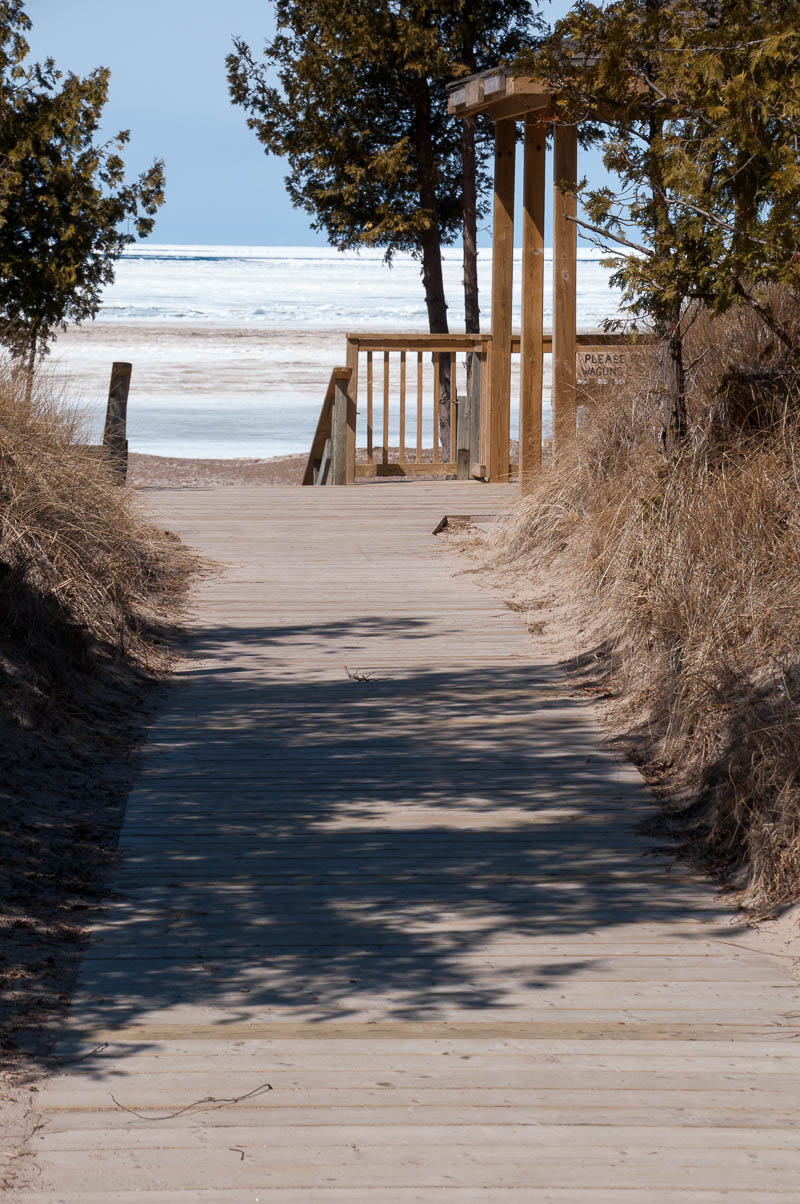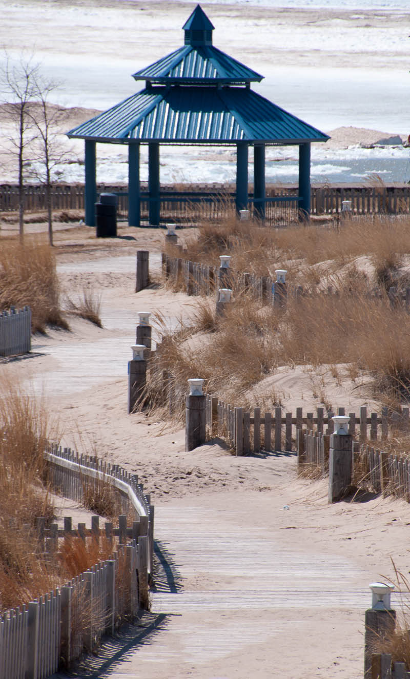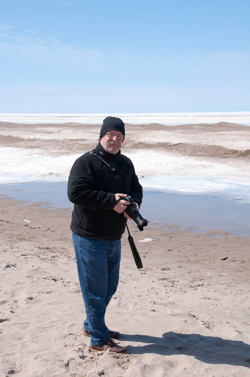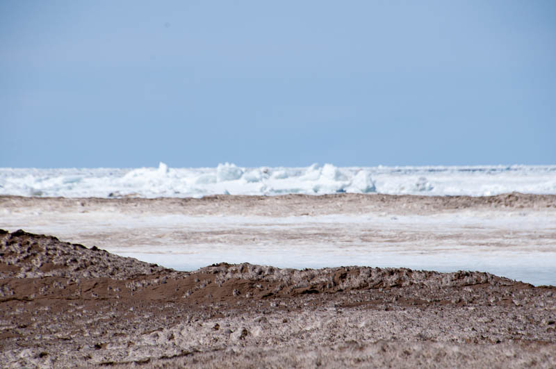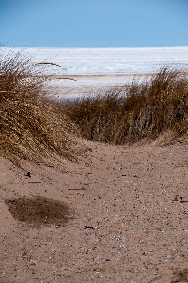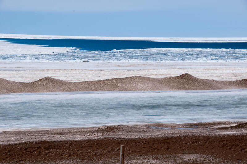 Not to waste this glorious (but chilly) day, we started going ’round the bend by heading down to the beach… Okay, so maybe it isn’t exactly beach chair and bathing suit weather, but it has potential! The white stuff isn’t surf (one could only hope), it’s ice and lots of it. The sand is quite lovely – soft, but also very hilly from the movement of the ice – but I’m betting you wouldn’t be able to find an uncovered square inch of it from mid-May to September!