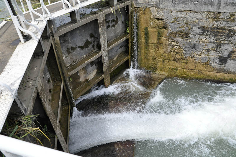 There are locks every few kilometres, and all the locks are operated manually. The drops from one level to another don’t look to be more than 10 feet, and the doors are not as tight, allowing quite a rush of water to stream through them continually.