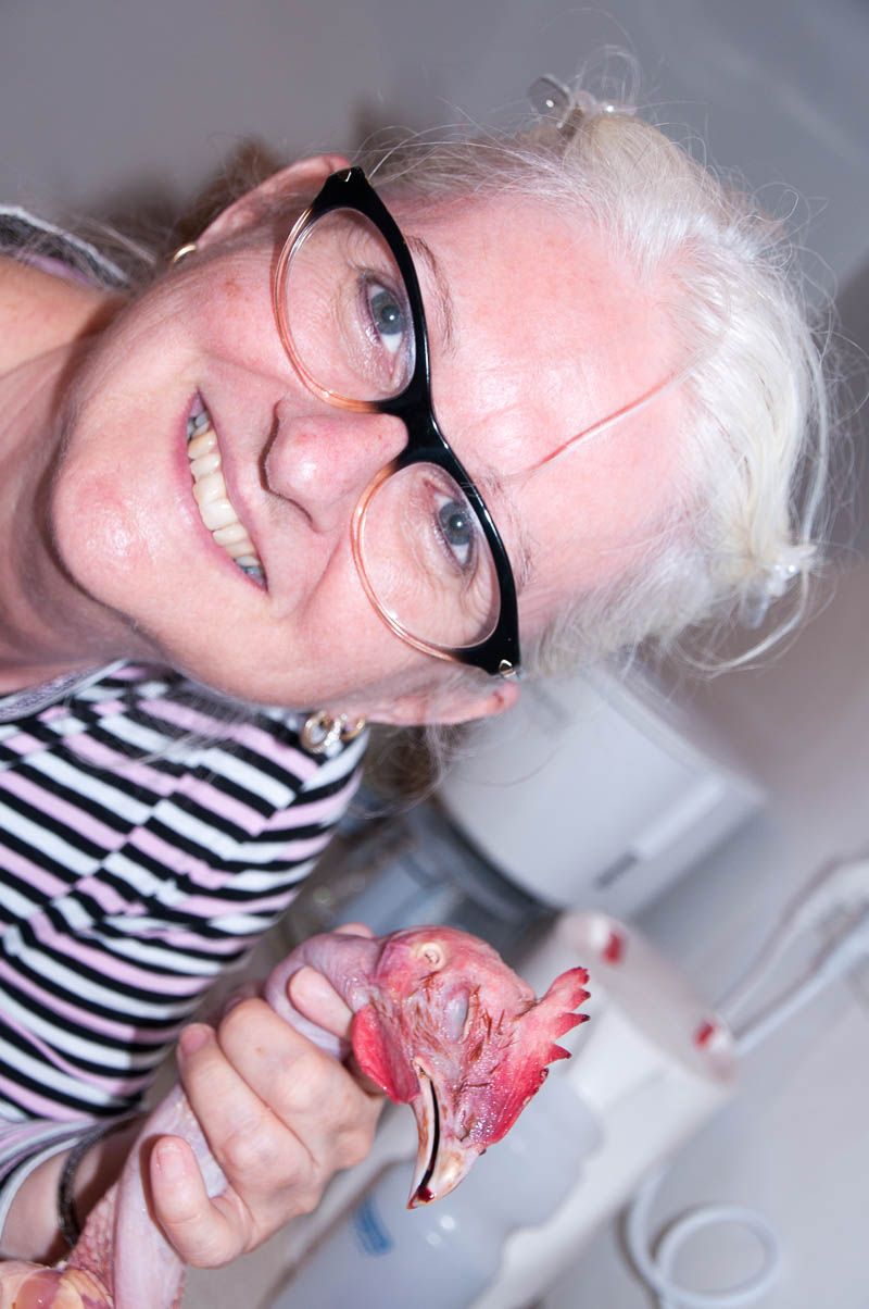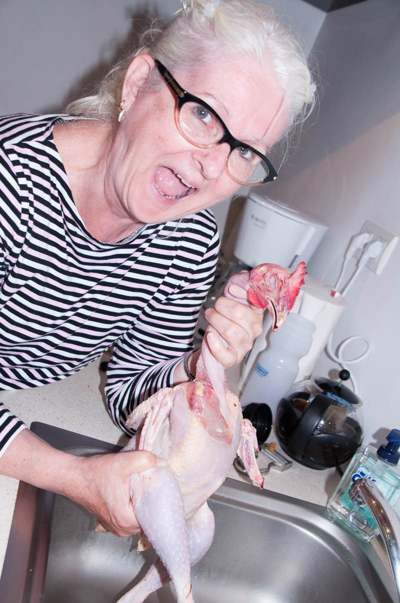Jan and I rolled up our sleeves and readied ourselves for dinner prep by having our “people” pour us some wine. We were all salivating over the promised roasted chicken. We took the bag out of the fridge, we fought with the sticky tape to get the bag undone, we lifted our prize bird out of the bag and ITS NECK AND HEAD FLOPPED OUT FROM UNDERNEATH ONE WING!!! And that, friends, resulted in a whole lot of screeching and hysterical laughter.