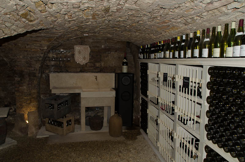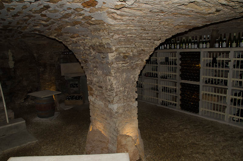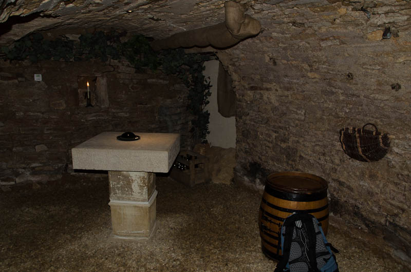 Then Franck took us downstairs to show us the cellar. Steve and I were expecting to see some kind of storage space, like there is at the cottage. What a surprise we got! Back on the street, Franck unlocked and opened metal double doors that stood no higher than 2 feet. Once open, he lifted the metal plates in the sidewalk that covered stone steps leading into a cellar. To get into the cellar, we had to go down the steps backwards, bending over until we were at the bottom so that we wouldn’t hit our heads on the stone ceiling. This was no storage space. This was a cellar in the true French sense. It was about 30’ square, with low ceilings high enough for us to stand comfortably in. It was all stone, complete with a few arches. There was crushed gravel on the floor, a wine barrel table, a stone table, a stone sink and draining board (there was a water supply), a rack that held many wine glasses, stone frames on 2 walls that held wine bottle storage, lots of stored wine, perfect ambient lighting, and a cooling system to keep all the wine at the right temperature. What a gem, completely underground and hidden from sight! The original use of the cellar, back in the day, was for coal storage. During the renovation of their apartment, he and the crew used this space to put all the debris, knowing that he would one day turn it into this little piece of paradise. Get this – when the time came, they had to be very careful to not dig too far down when excavating the garbage and some of the floor to enable enough height to stand up, as Beaune has layers of underground caves and it might have been possible to dig too deep and fall through into another cellar below this one!!! It took Franck and some friends 2 years to complete the cellar, but what a reward at the end. Unfortunately, it is not part of the rental package of the apartment 🙁