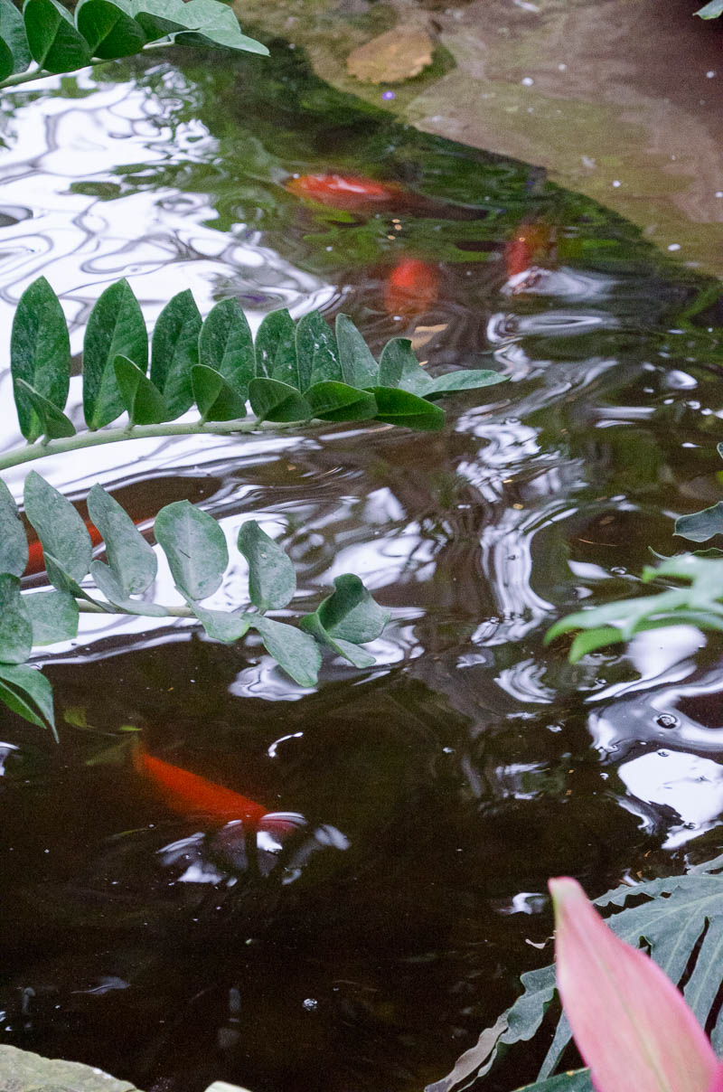 The conservatory isn’t very large but it is jam-packed full of discovery. And what’s down there? A pond – with fish, a turtle, a waterfall, and what looks like a butterfly that floats!