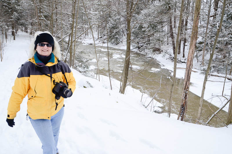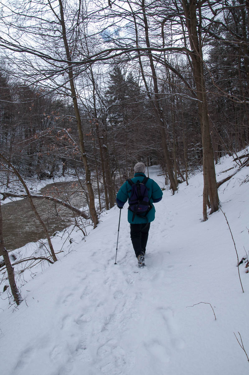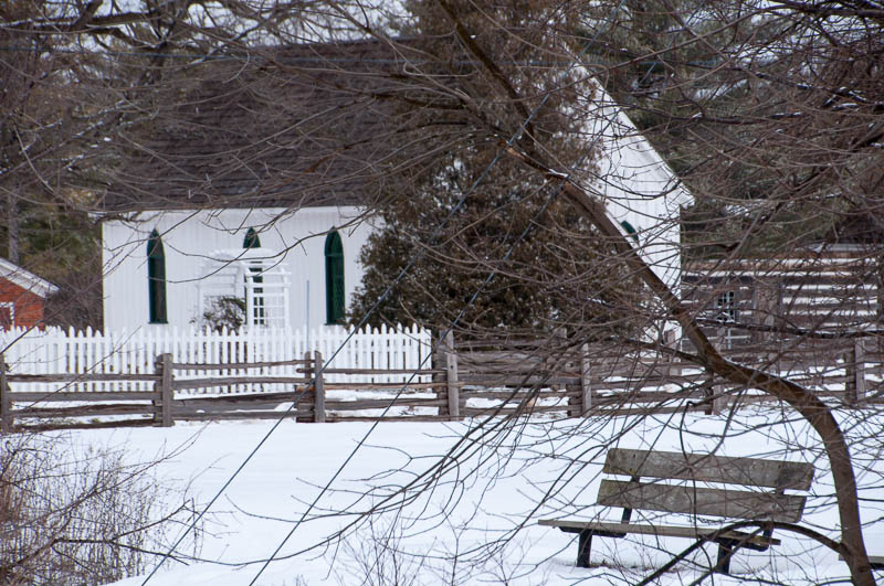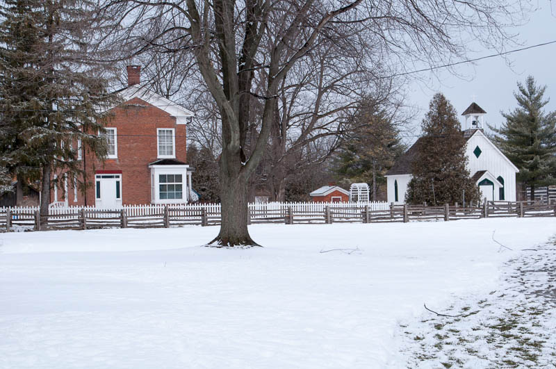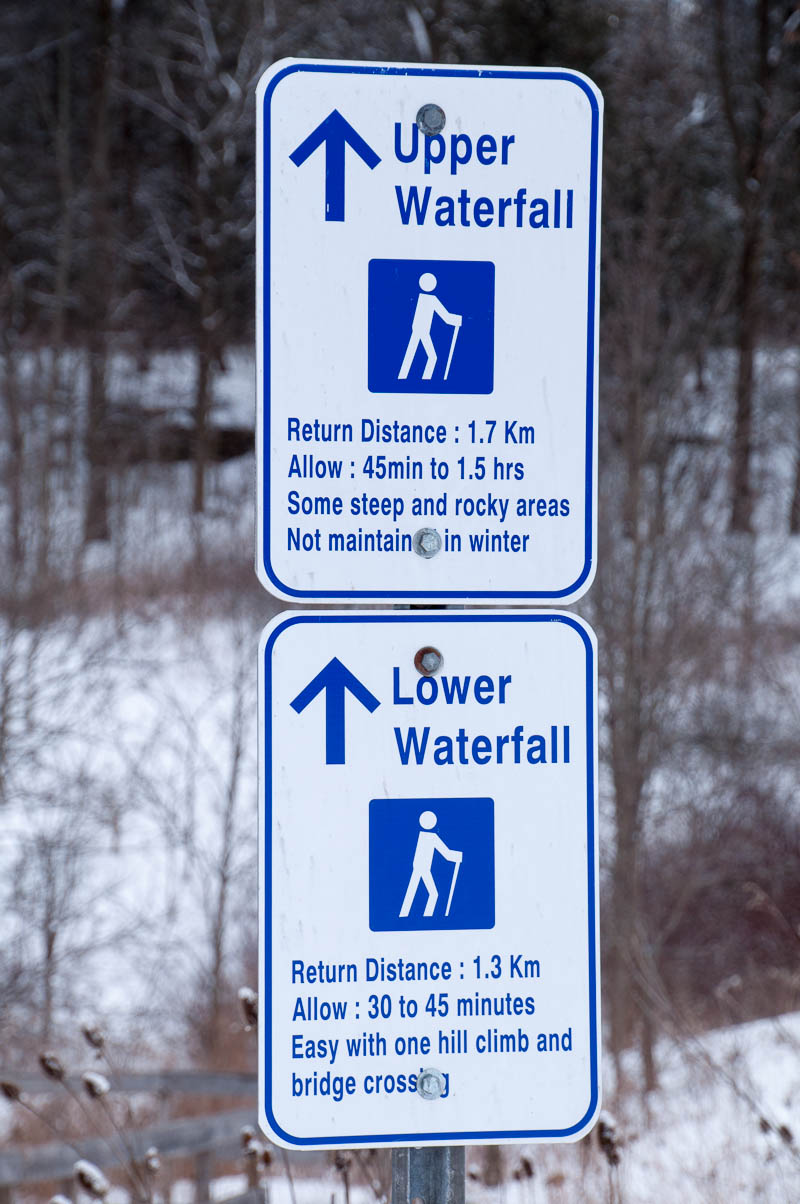 There wasn’t enough snow for the toboggan hill but the hiking trails were close to perfect. We decided to head to the higher falls, the longer hike, but not before we headed in the other direction for a quick peak at some of the historic buildings.