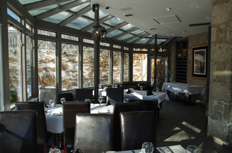The Inn was old, quaint, and very welcoming. Our room – The Harrett Suite, in the adjoining Carriage House – was exquisite, but we had to wait to fully check it out as the main event was about to get under way. The dining room, dressed in its finery, was full and, in fact, we were lucky to get the last table, and luckier still that it was on the outside of the greenhouse-style room so we had a lovely view of the lit, walled garden. (I’m sure the garden is spectacular in the summer, but it was still pretty in its winter-ready state.)